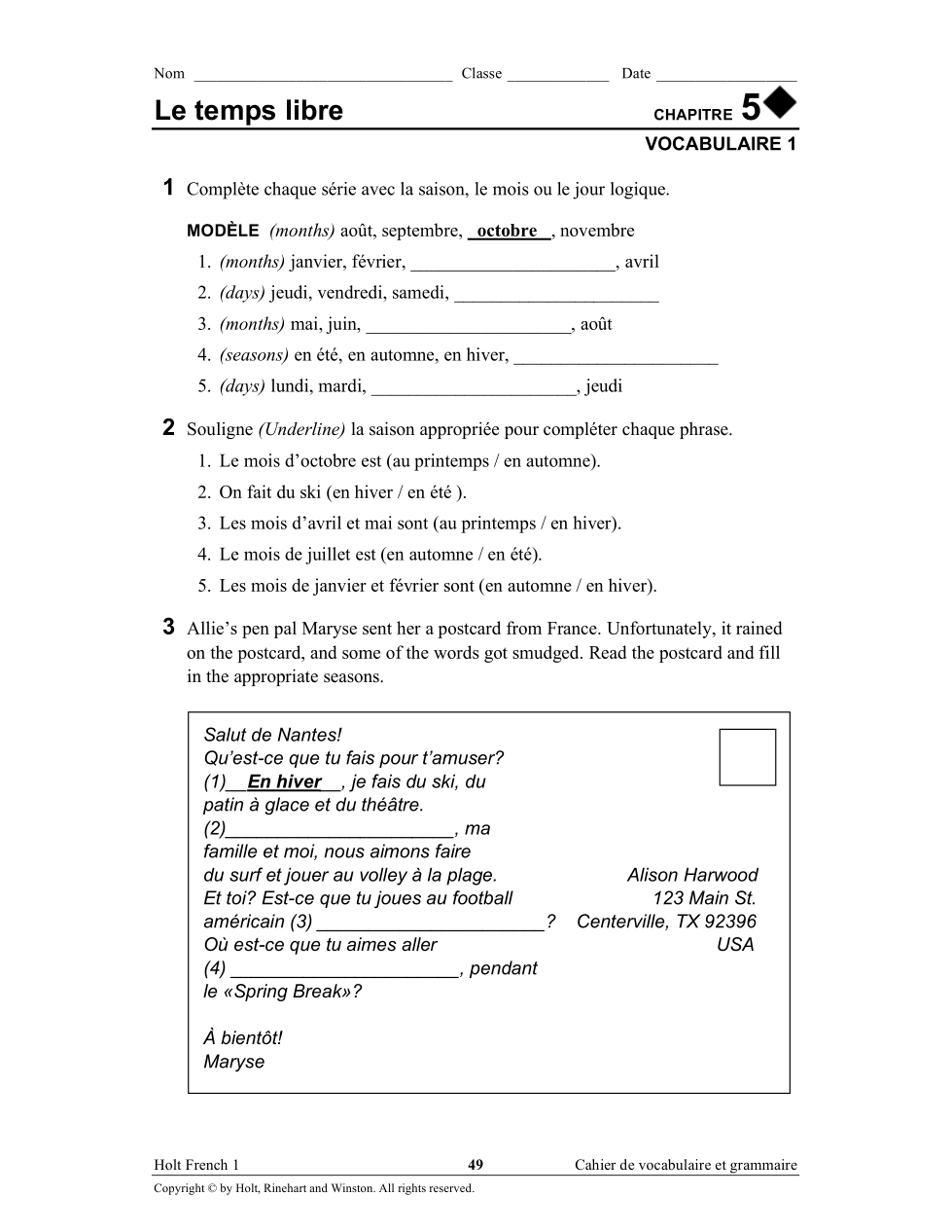 Choose your favorite season (En hiver, Au Printempts, En été, En autumne) and write 5 sentences about it. 1) Name the season 2) describe the weather using 2 different expressions, 3) write 3 activities you like (aimer faire) 4) write 2 actitivies you cannot do (on ne peut pas...)