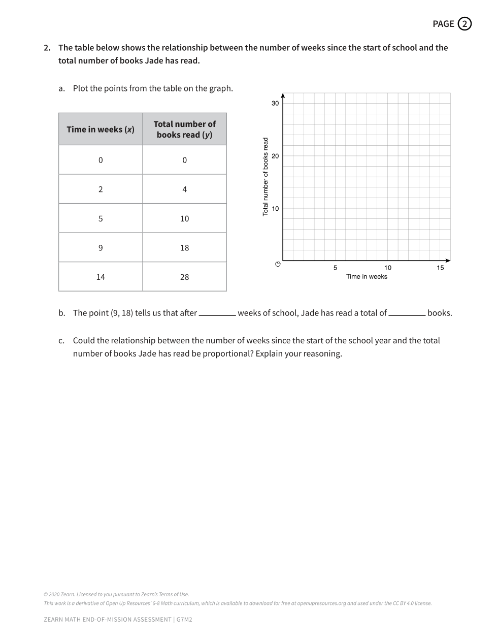 2b. The point (9, 18) tells us that after ___ weeks of school, Jade has read a total of ____ books.