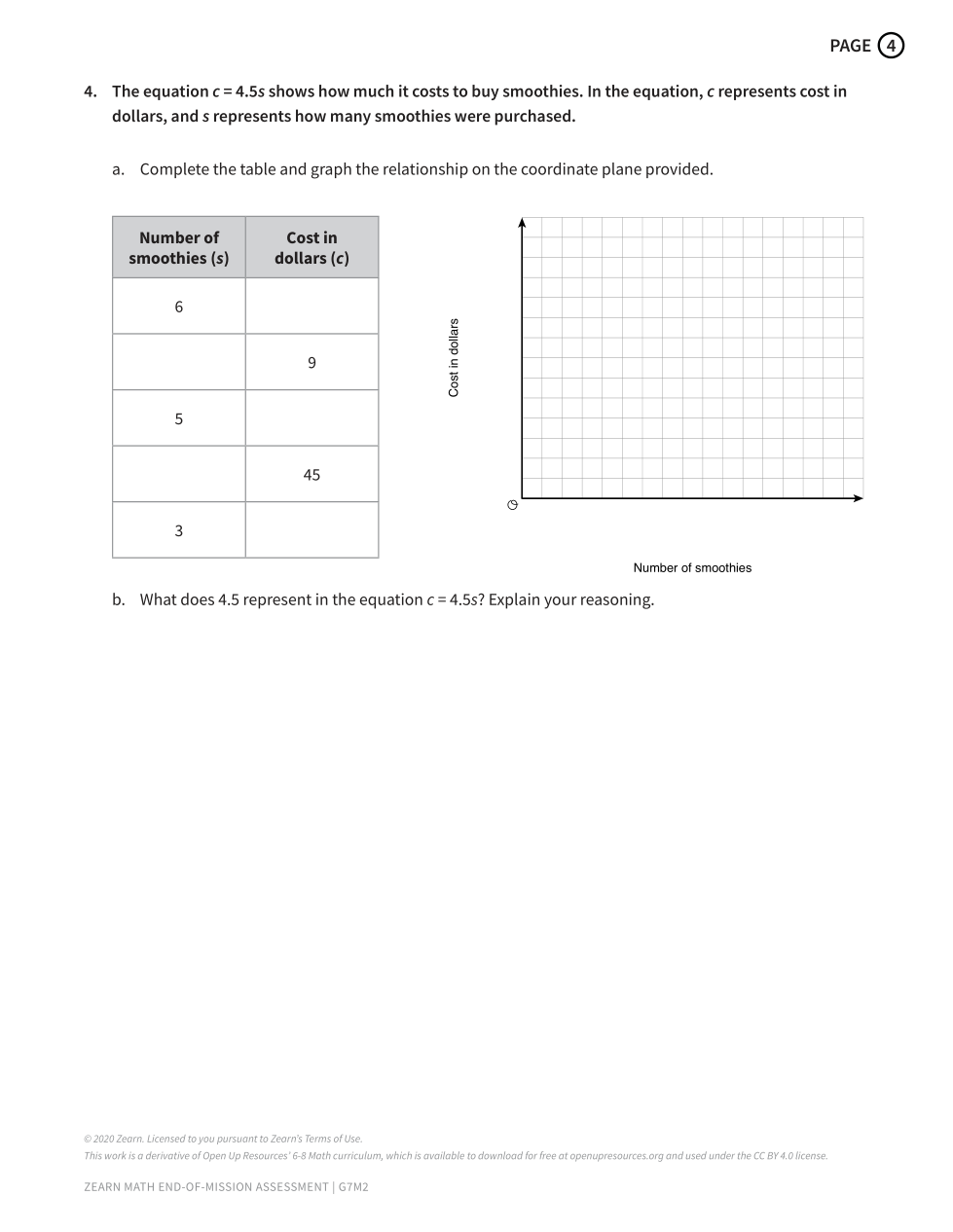 4. The equation c = 4.5s shows how much it costs to buy smoothies. In the equation, c represents cost in dollars, and s represents how many smoothies were purchased.