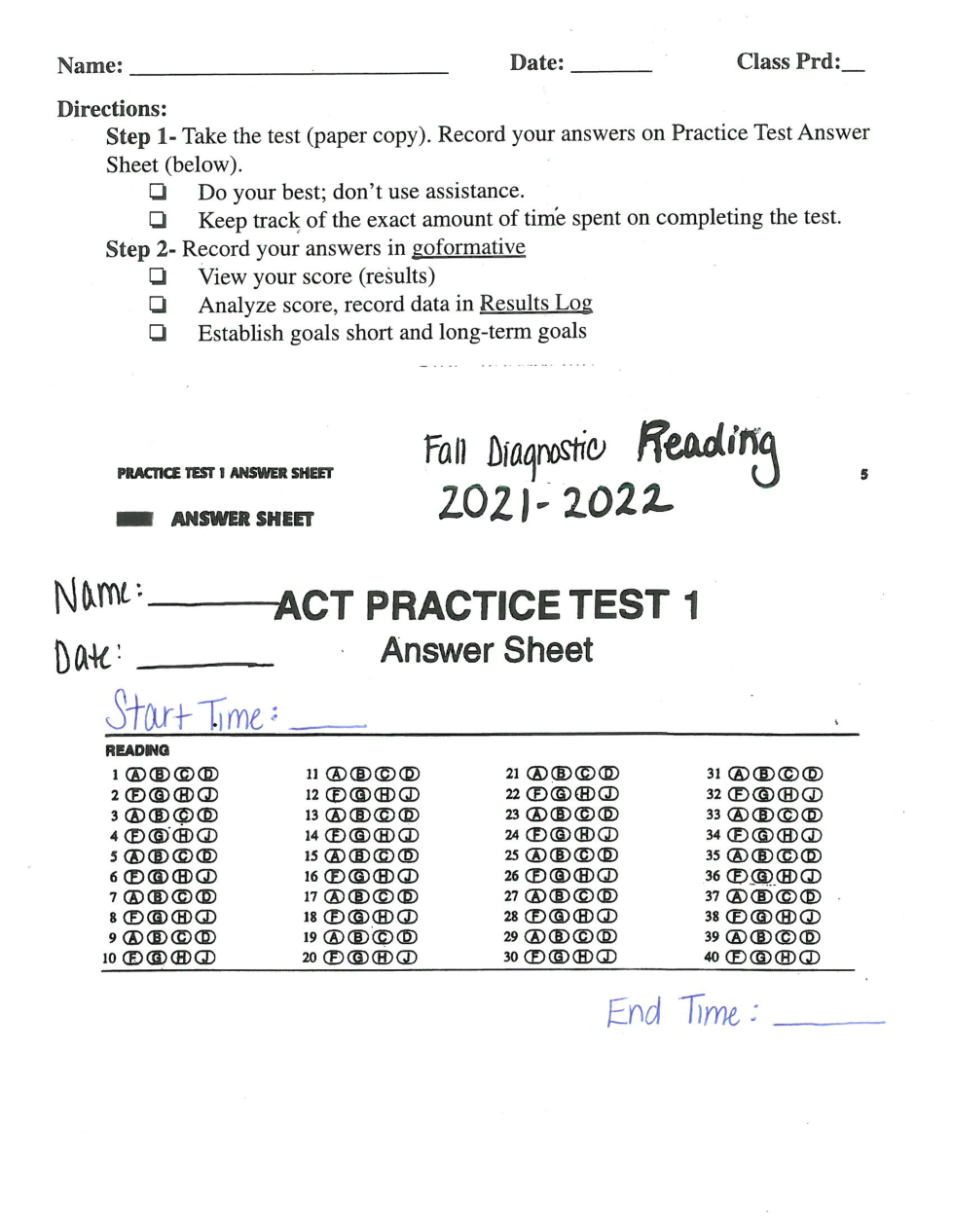 2021-2022 Fall Diagnostic READING Test