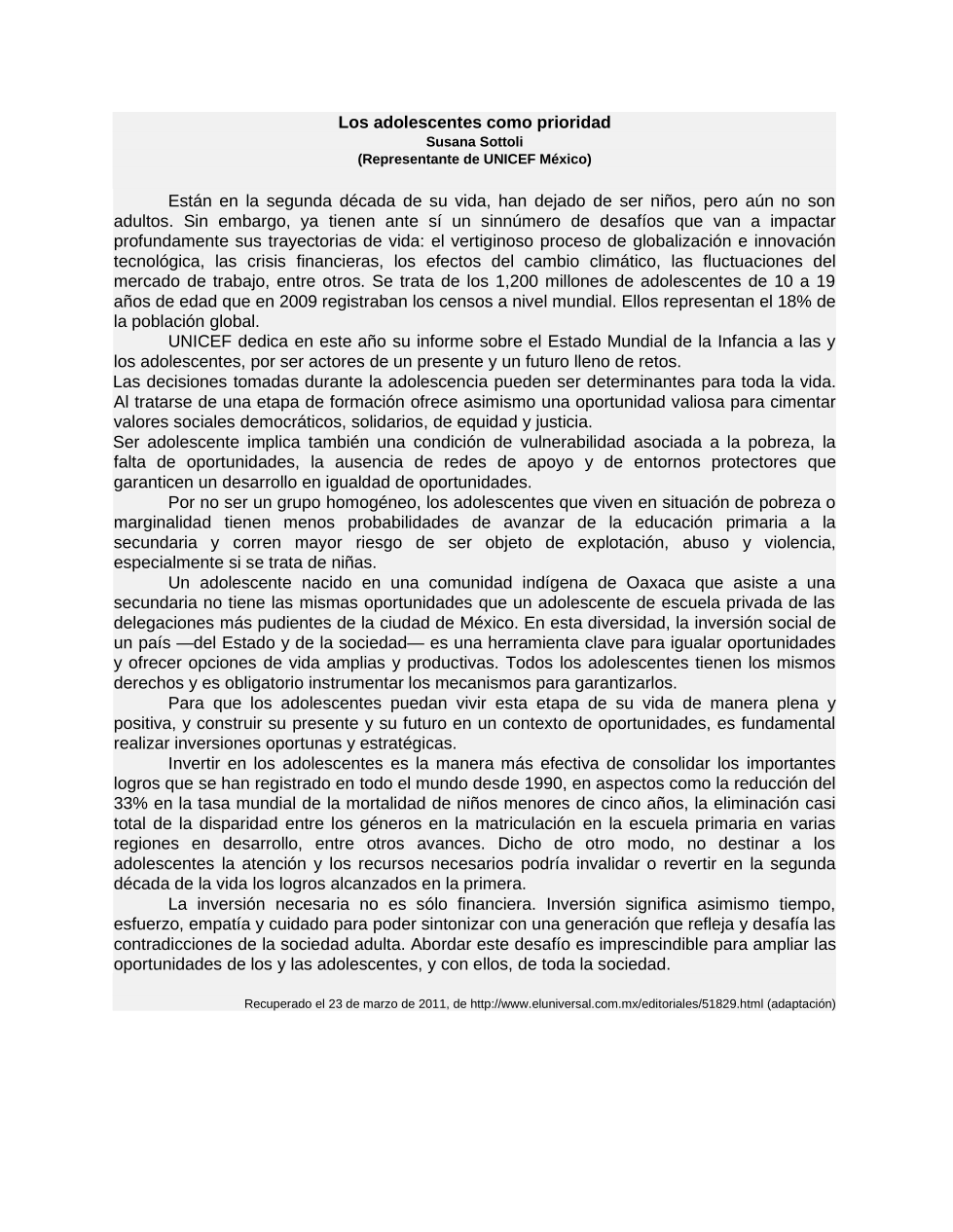 Justifica tu respuesta anterior elegiendo las cararcterísticas del texto "Los adolescentes como prioridad"