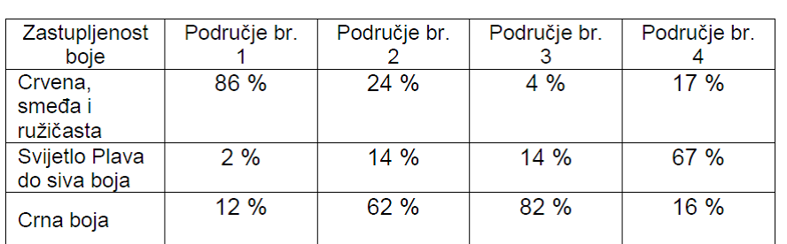 Učenici proučavaju satelitske snimke nekoliko područja (infracrveni otisak u boji, Landsat TM). Utvrdili su pretežitu zastupljenost boja na četiri (4) različita područja koja su označili brojevima od 1 do 4.