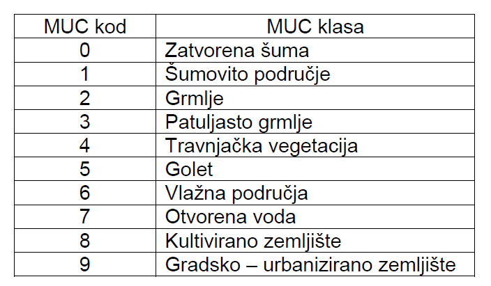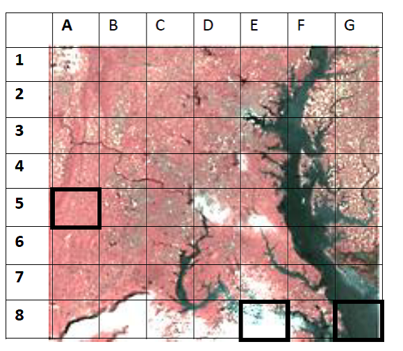 Priložena je satelitska slika nekog područja. Služeći se MUC klasifikacijom (tablica) odredite tip pokrova (samo I. razina MUC-a) u označenim kvadrantima (A-5, E-8 i G-8)