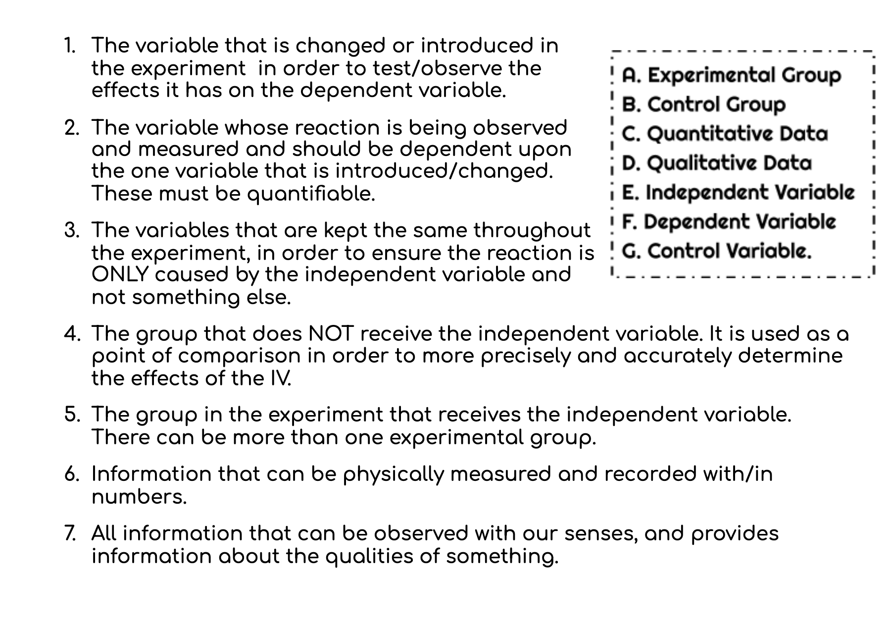 The variable whose reaction is being observed and measured and should be dependent upon the one variable that is introduced/changed. These must be quantifiable.