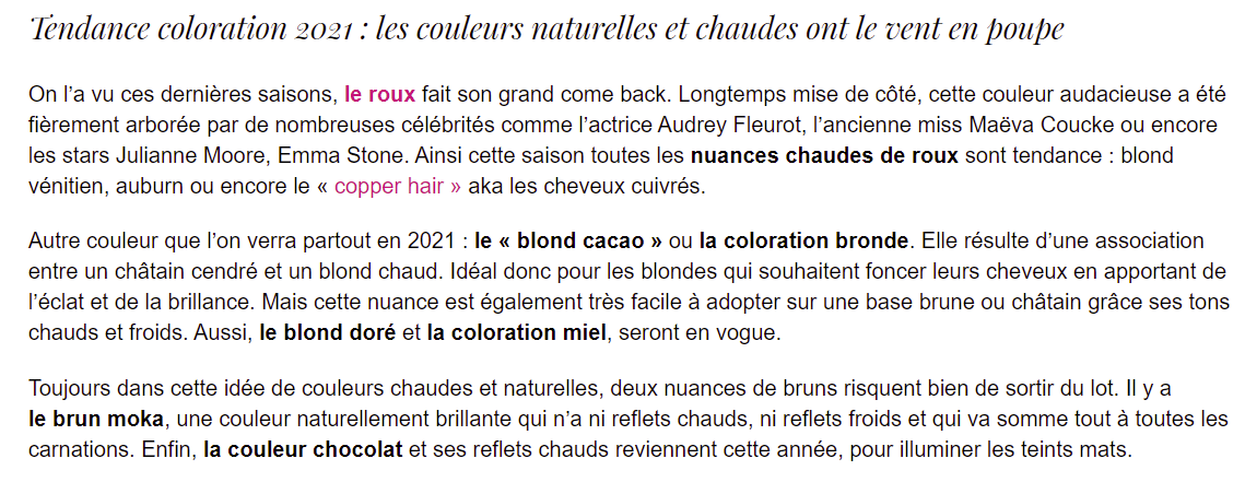 The excerpts below come from the article posted here - Tendance coloration 2021 : 18 idées de couleurs à copier pour sublimer sa chevelure !