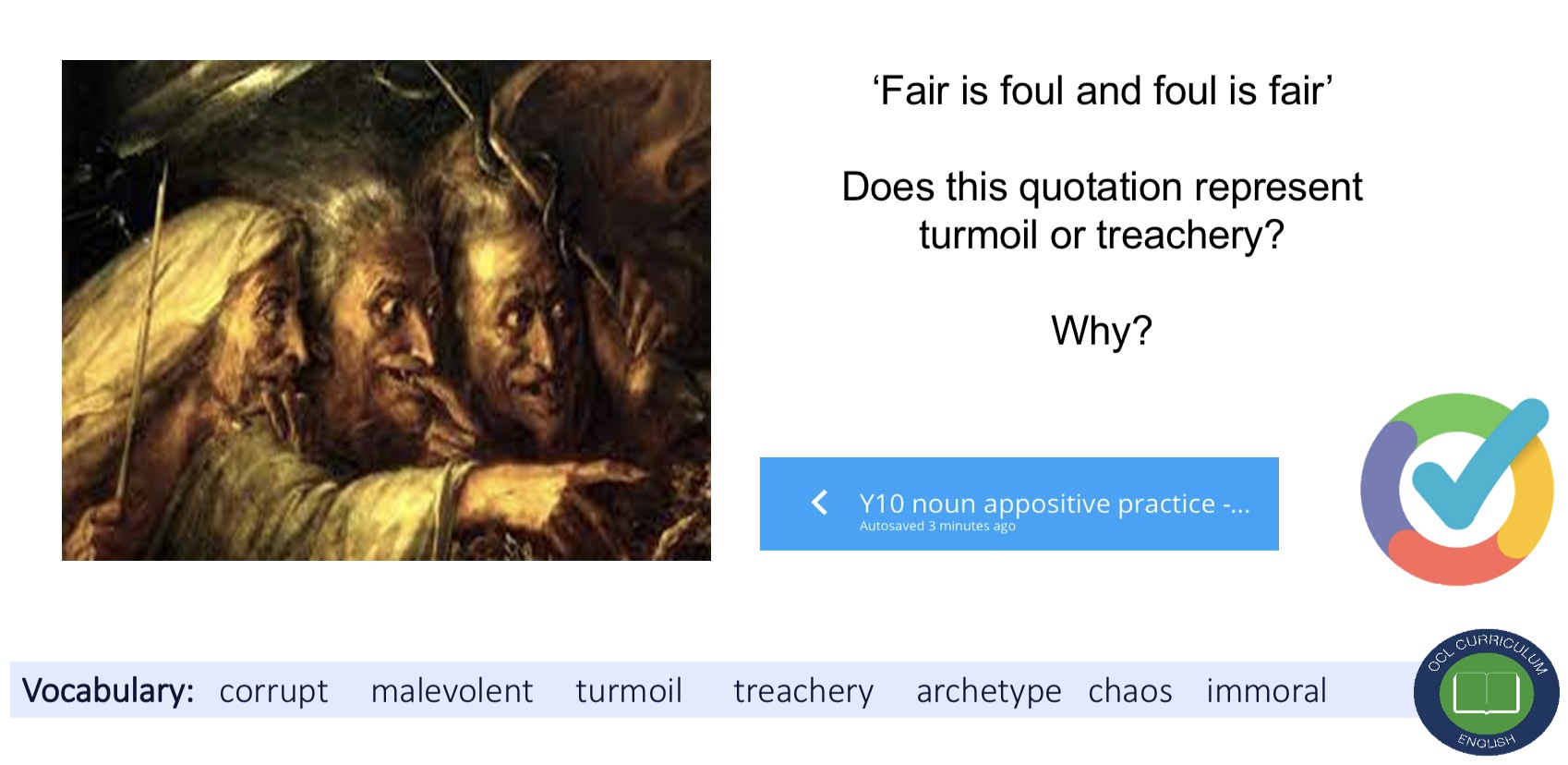 Which noun appositive best describes the witches?From the start of the play, the witches, ____________________, set out on a mission to cause chaos.