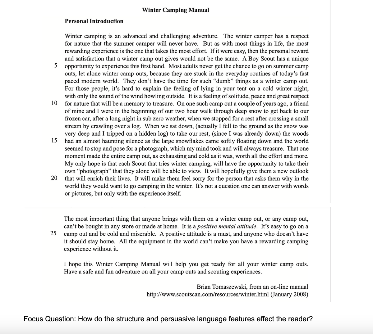 Identify and explain how 3-5 language features aid in the purpose of the text: