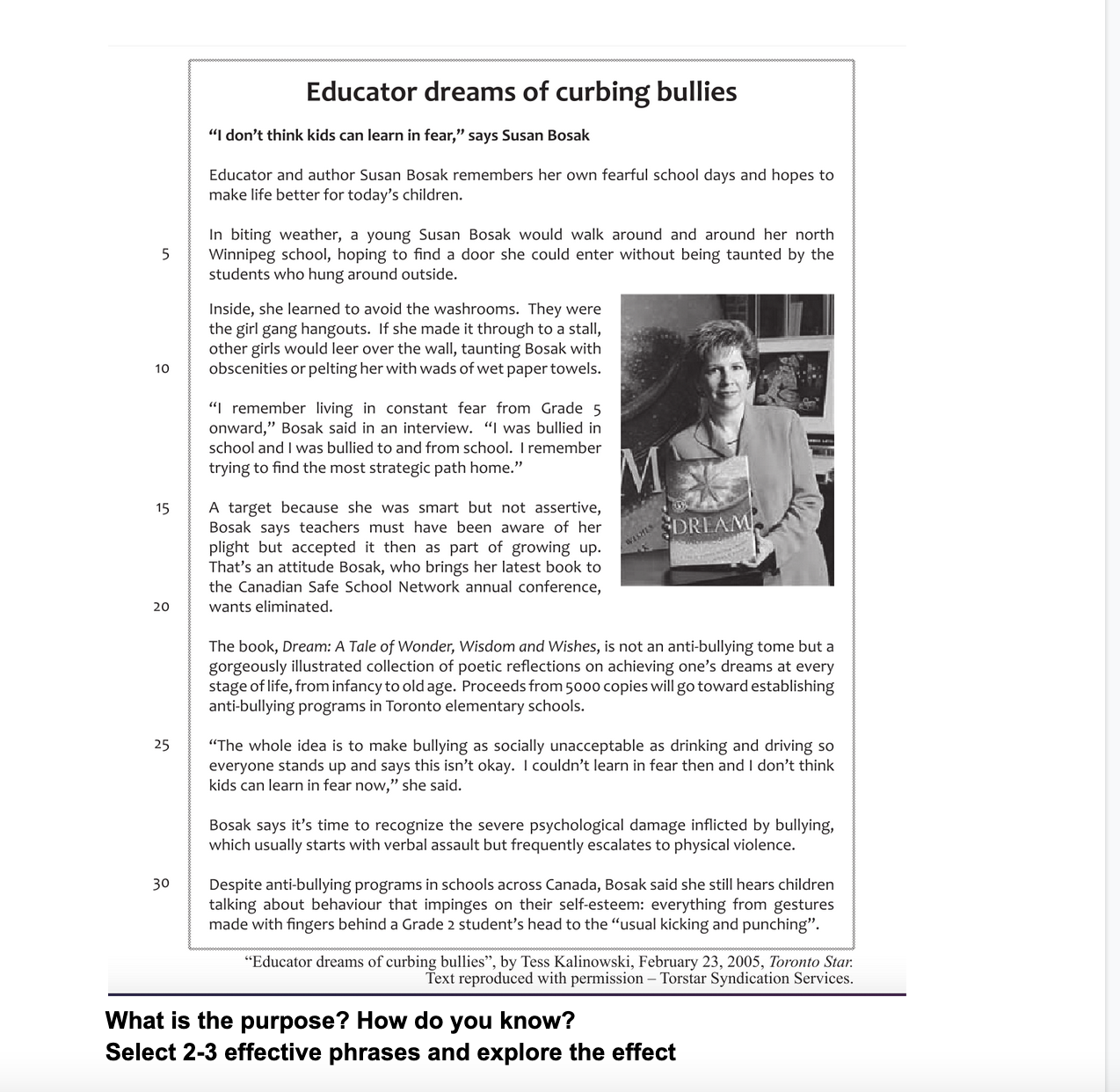 Select evidence (2-3 pieces) and explore the effect on the reader linked to the purpose.