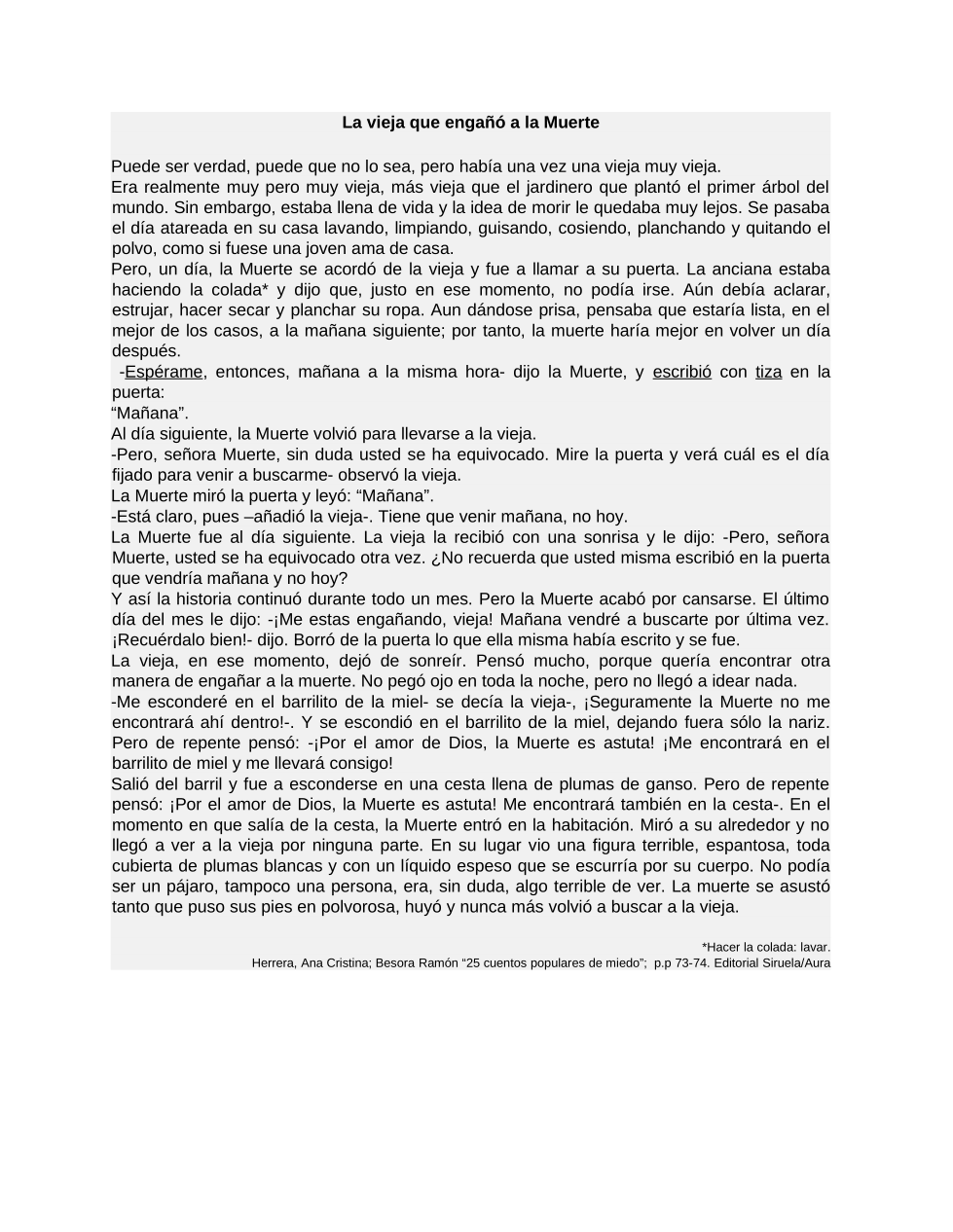 Que la Muerte se alejara por el susto que se llevó al ver a la vieja disfrazada de un ser terrible, fue resultado de: