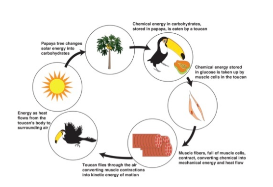 El diagrama muestra el ciclo de energía dentro de un ecosistema que contiene un árbol de papaya y un tucán. La dieta diaria de tucanes consiste en cuatro papayas y una variedad de frutos secos que cubre la mayoría de sus necesidades nutricionales. Una enfermedad ha infectado a la población del árbol de papaya, causando que la papaya produzca menos glucosa almacenada.Luego de discutir con tu pareja, escribe una explicación científica para describir el impacto de los árboles de papaya infectados en la población de tucán.