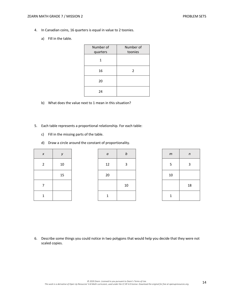 5. Each table represents a proportional relationship. For each table:c) Fill in the missing parts of the table.d) Draw a circle around the constant of proportionality.