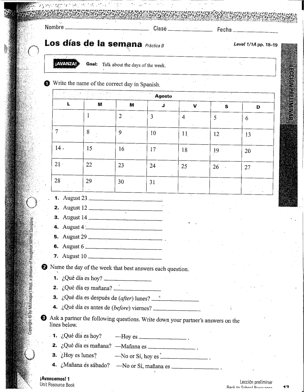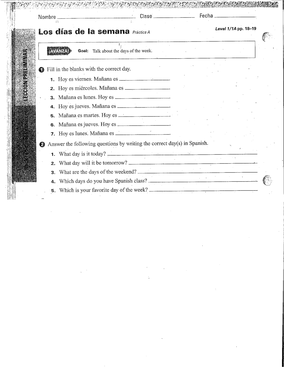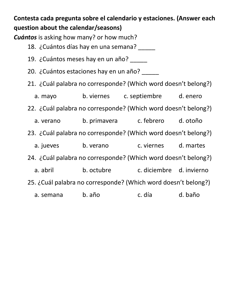 You can keep trying for a perfect score on this during class today. The key will grade your typed answers accurately if you type with no extra spaces and use accents as needed. Remember: the week starts on Monday on Spanish calendars, and you don't capitalize days of the week or months of the year in Spanish.