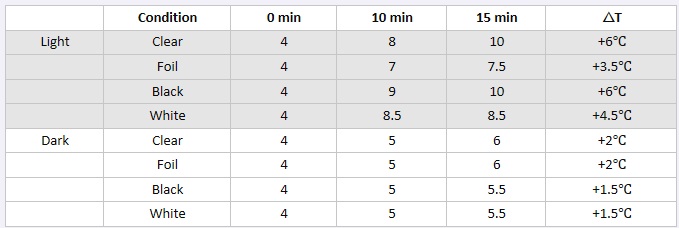 Looking at the data below, why would we put the cups in the dark if we were trying to test what effect light has on the temperature?