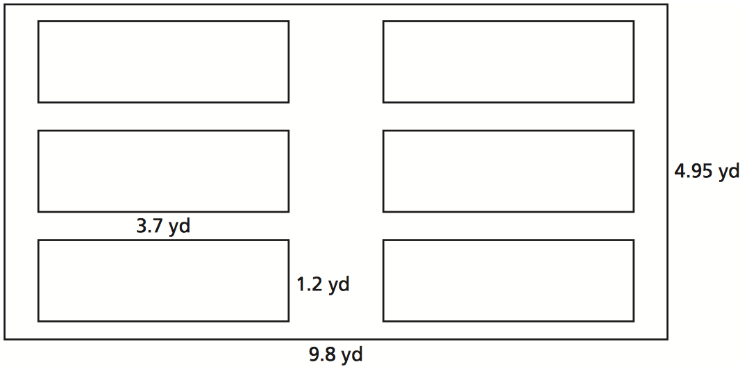 Mahassen wants to know how much area she will have in each of the six rectangular plots for growing plants. What is the area of one of the plots?