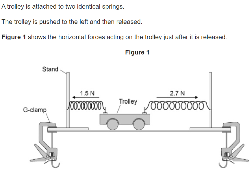 The trolley has a mass of 0.75 kg. Calculate the acceleration of the trolley just after it is released. Give the unit.