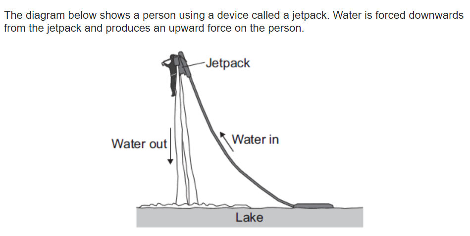 The person weighs 700 N and the jetpack weighs 140 N.      Calculate the combined mass of the person and the jetpack.Gravitational field strength = 10 N/kg