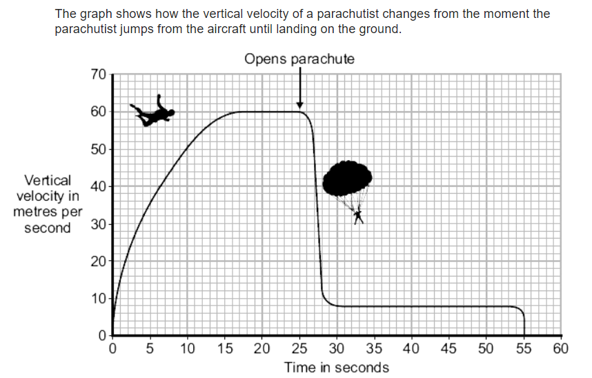 Using the idea of forces, explain why the parachutist reaches a terminal velocity and why opening the parachute reduces the terminal velocity.