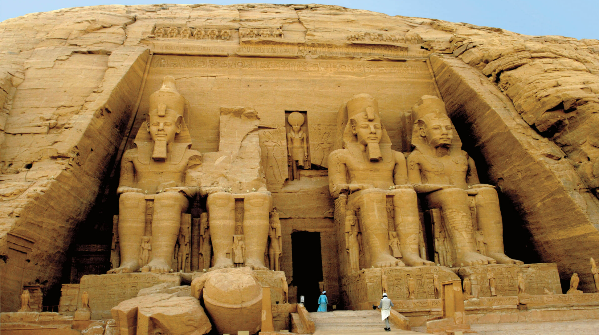 The four statues of King Ramses II at this temple provide an example of ancient Egyptian art. Small figures of Ramses’ children, his queen, and his mother are carved around his feet. Dedicated to the sun gods, the temple was built in such a way that, on two days of the year, the first rays of the morning sun shine through the building and light up the entire temple. What do the number and size of the figures of Ramses II indicate about his importance in ancient Egyptian society?