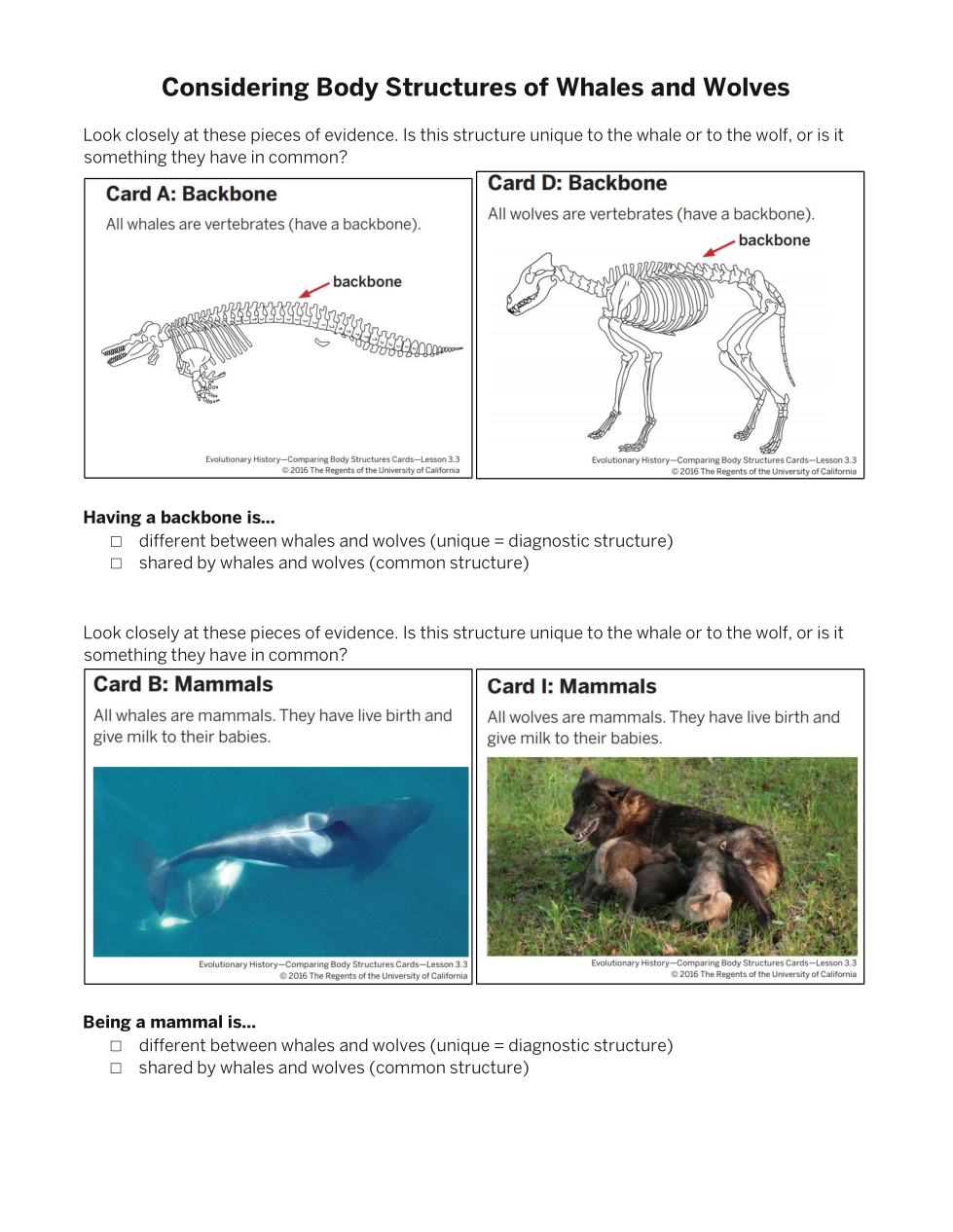 Look at cards B and I. Are both whales and wolves mammals?