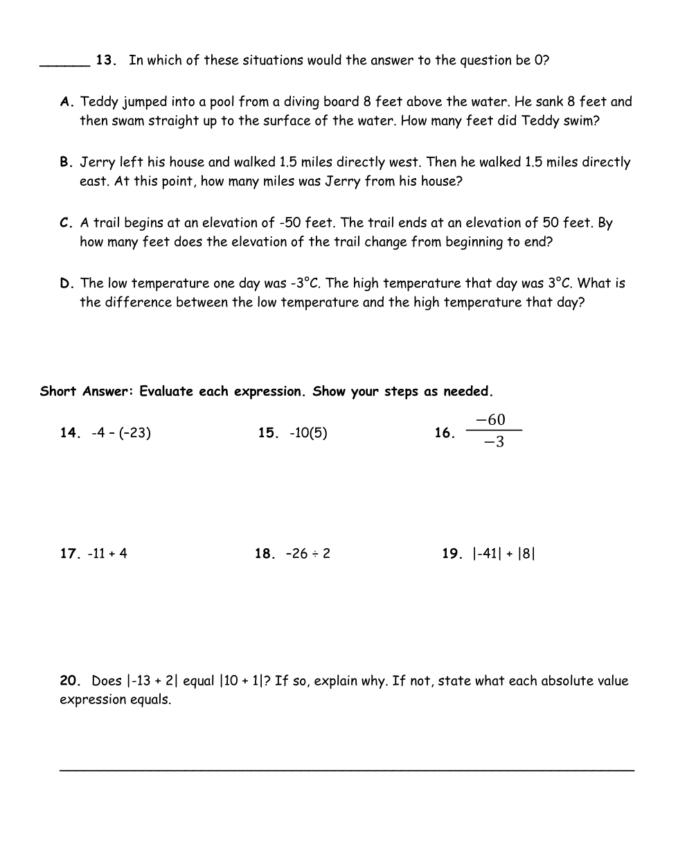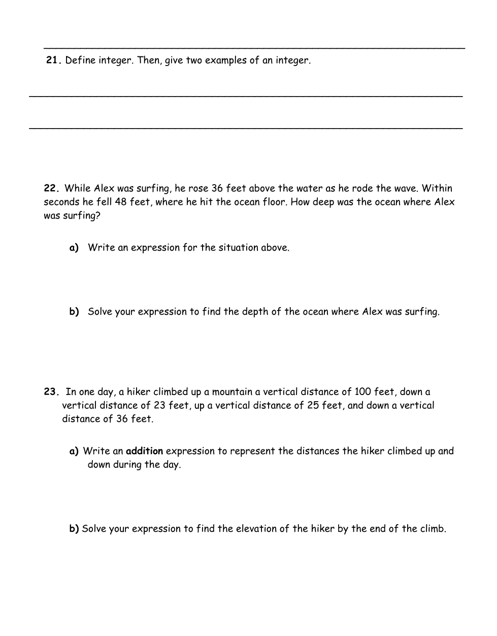 23a) In one day, a hiker climbed up a mountain a verticla distance of 100 feet, down a vertical distance of 23 feet, up a vertical distance of 25 feet, and down a vertical distance of 36 feet. Write an addition expression to represent the distances the hiker climbed up and down during the day.