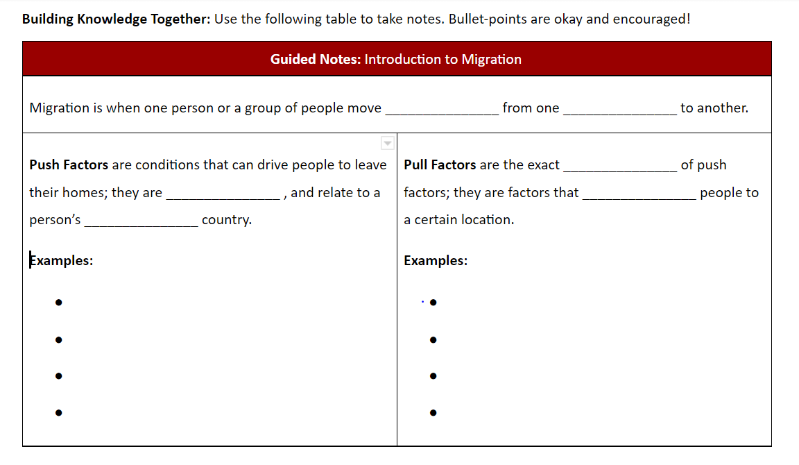 Use the "Show Your Work" function to take notes on Migration and the difference between push and pull factors.
