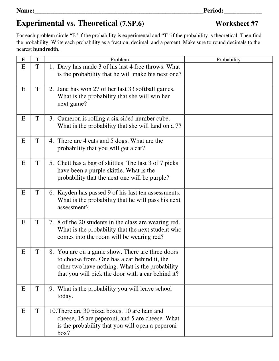 7LRIS Honors WS #7 - Blue Experimental vs. Theoretical Probability