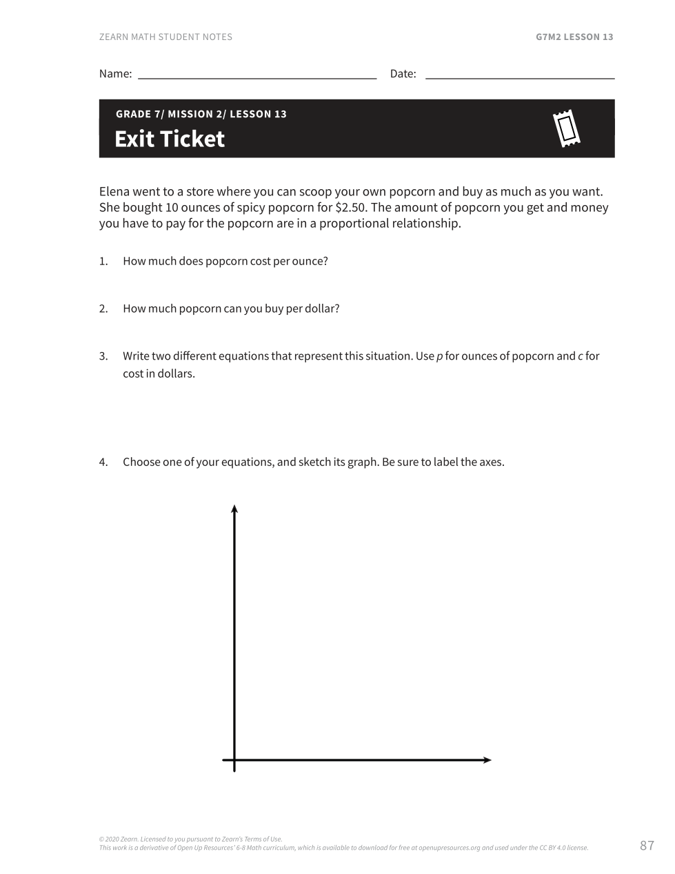 EXIT TICKETElena went to a store where you can scoop your own popcorn and buy as much as you want. She bought 10 ounces of spicy popcorn for $2.50. The amount of popcorn you get and money you have to pay for the popcorn are in a proportional relationship.