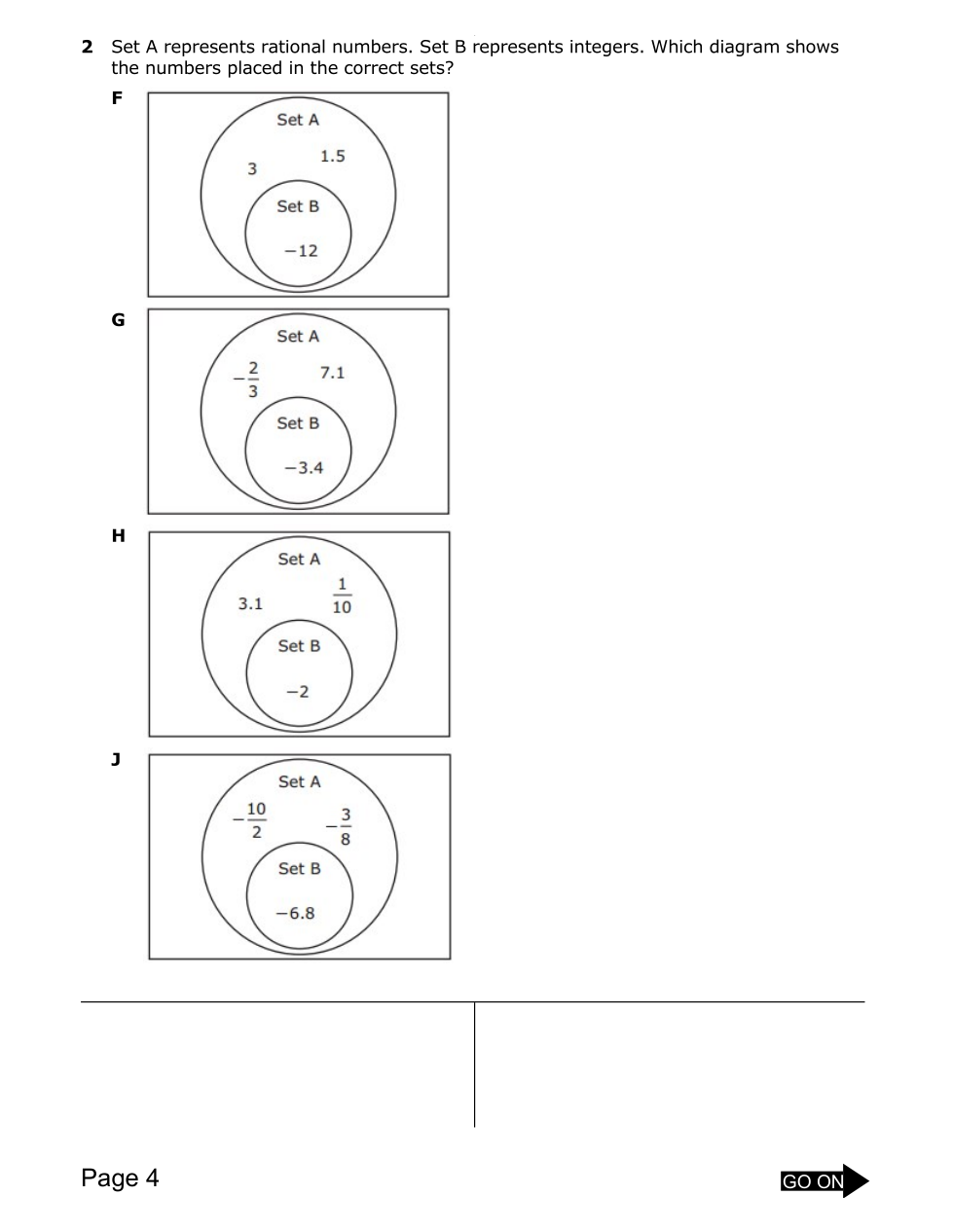 Set A represents rational numbers. Set B represents integers. Which dia gram shows the numbers placed in the correct set?