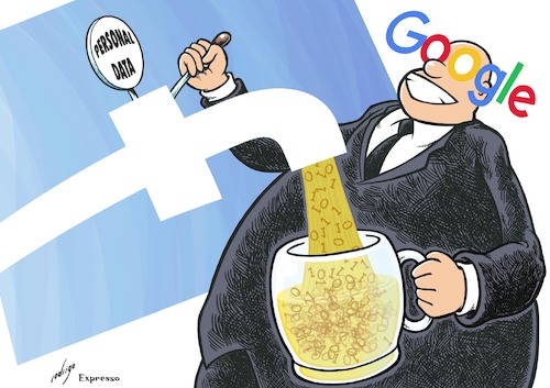 1) List all of the objects/symbols you see in the cartoon2) What words appear in the image?3) Describe the action taking place in the cartoon4) Explain the message of the cartoon