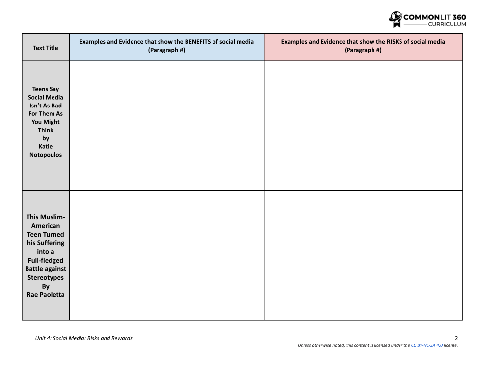 CommonLit: "This MuslimAmerican Teen Turned his Suffering"Examples and Evidence that show the RISKS of social media (Paragraph #)