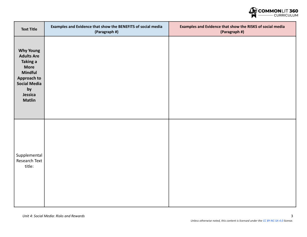 CommonLit: "Teens Say Social Media Isn't As Bad"Examples and Evidence that show the RISKS of social media (Paragraph #)