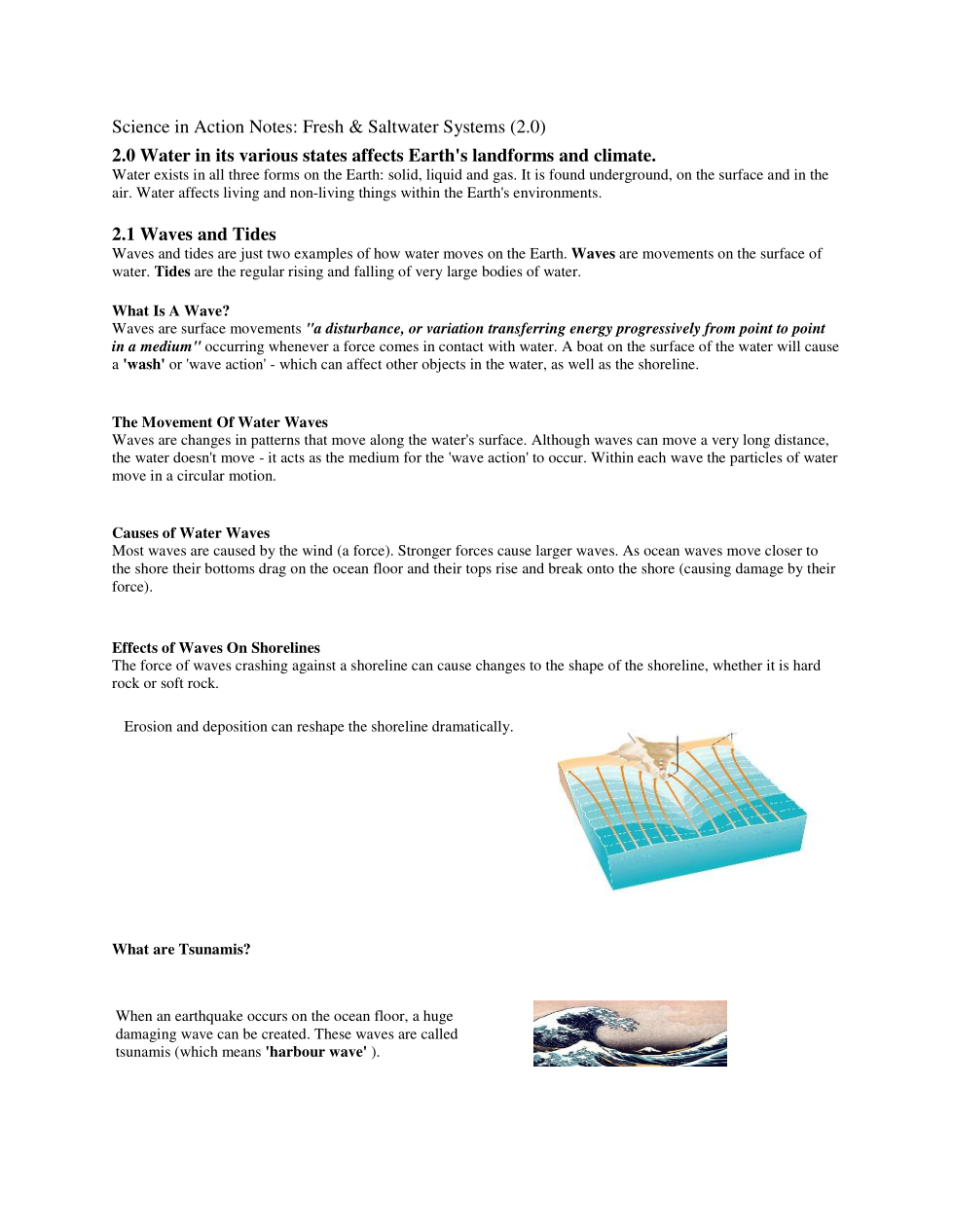 Most waves are caused by the wind. The stronger the wind, the bigger the wave. The most damage caused by a wave comes from ...