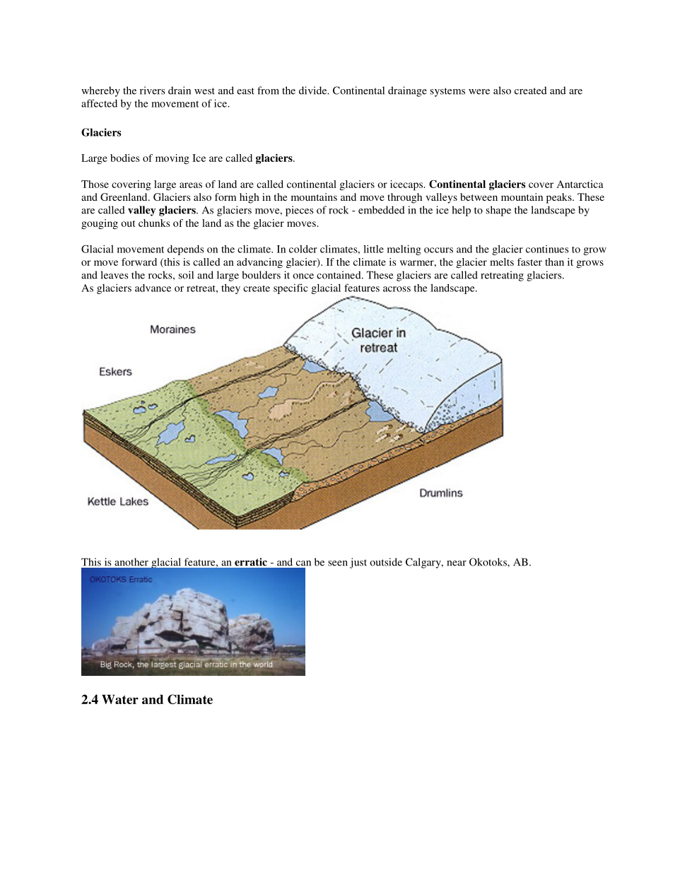 Glaciers gouge huge areas of the land and then reshape the land by the materials they collect. Some of the features include large inland lakes, where the glacier has dug a huge hole and filled it with water. These inland lakes are called ...
