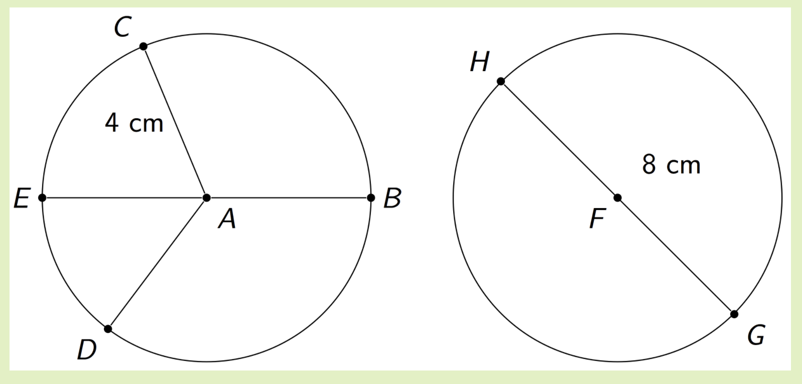 Here are two circles. Their centers are A and F.- What is the same about the two circles? What is different?