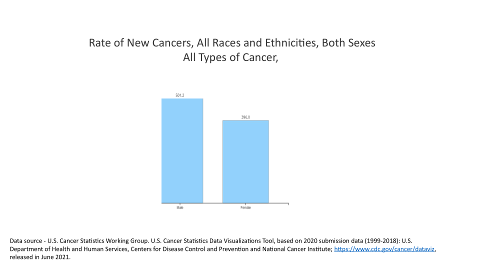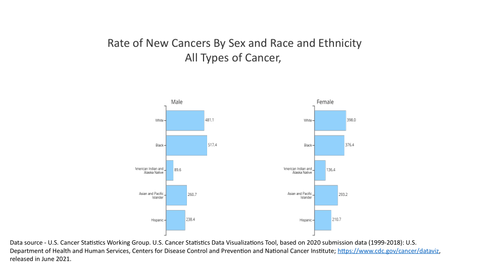 Look at the data, does gender and race differ in who is more likely to develop cancer? If so, how?