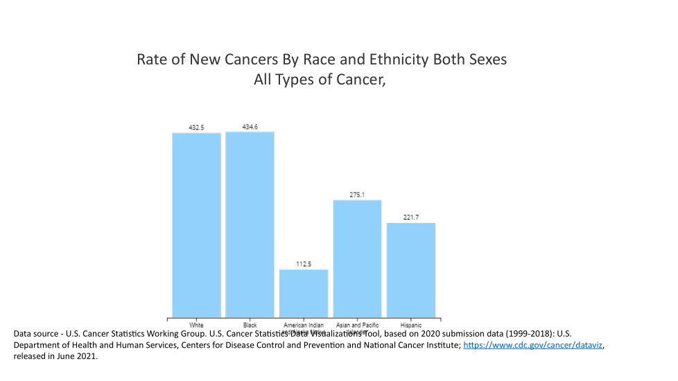 Out of the five races mentioned in the data, which race is the least likely to develop cancer?