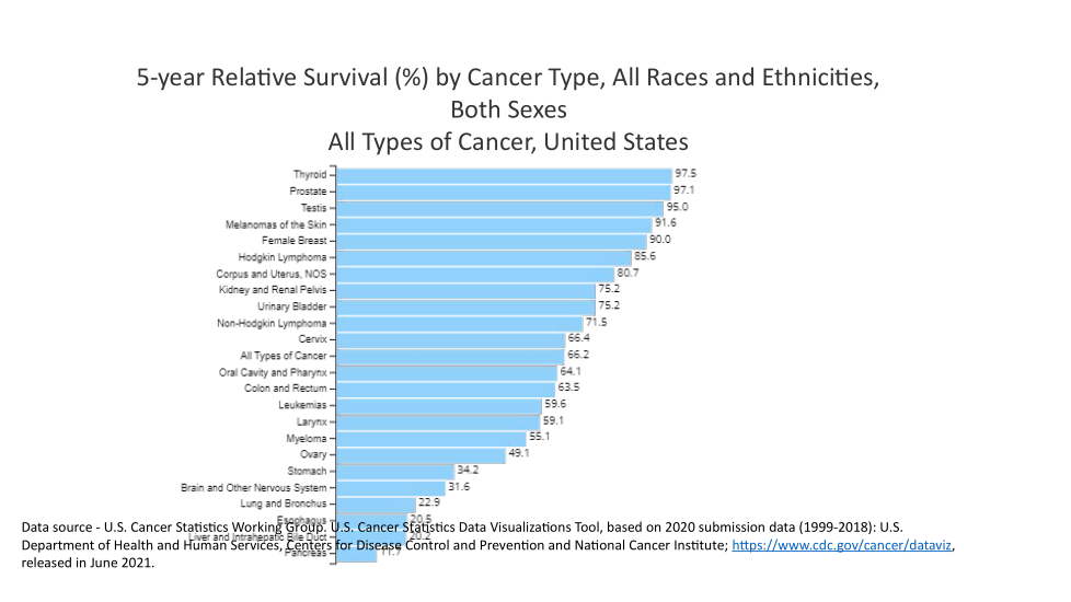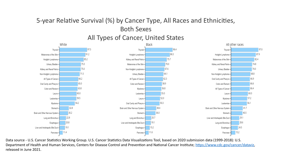 Thyroid Cancer has the highest survival rate while Pancreatic cancer has the lowest survival rate in all the races.