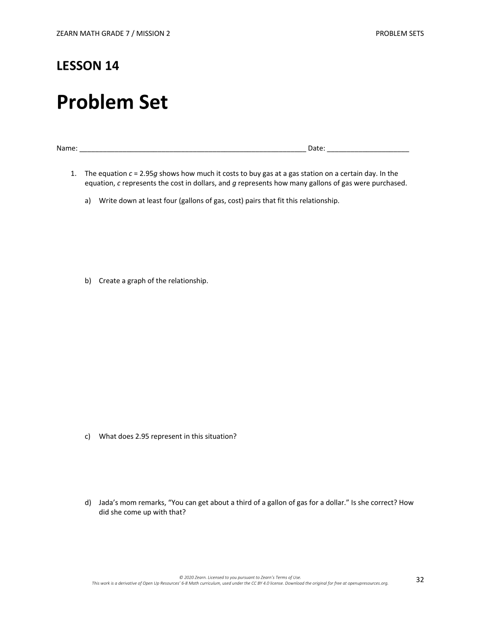 1a. Write down at least four (gallons of gas, cost) pairs that fit this relationship.