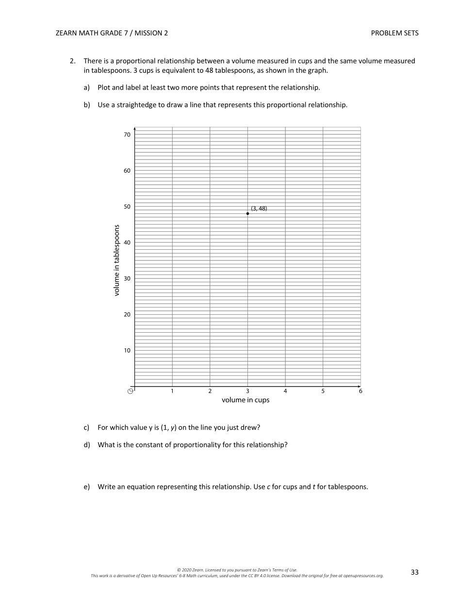 2. There is a proportional relationship between a volume measured in cups and the same volume measured in tablespoons. 3 cups is equivalent to 48 tablespoons, as shown in the graph.