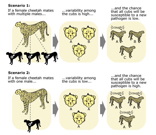 Look at the image above. How has the described mating behavior of cheetahs improved their genetic diversity? How does that increase the cheetah's chances of survival?