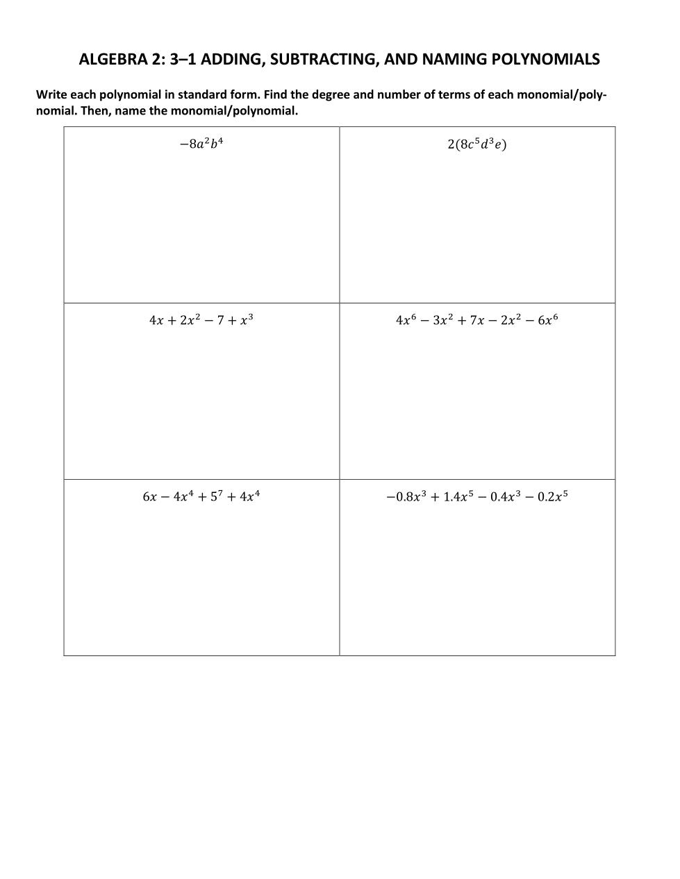 Which of the following is in the name of the polynomial 4x6 - 3x2 +7x - 2x2 - 6x6?