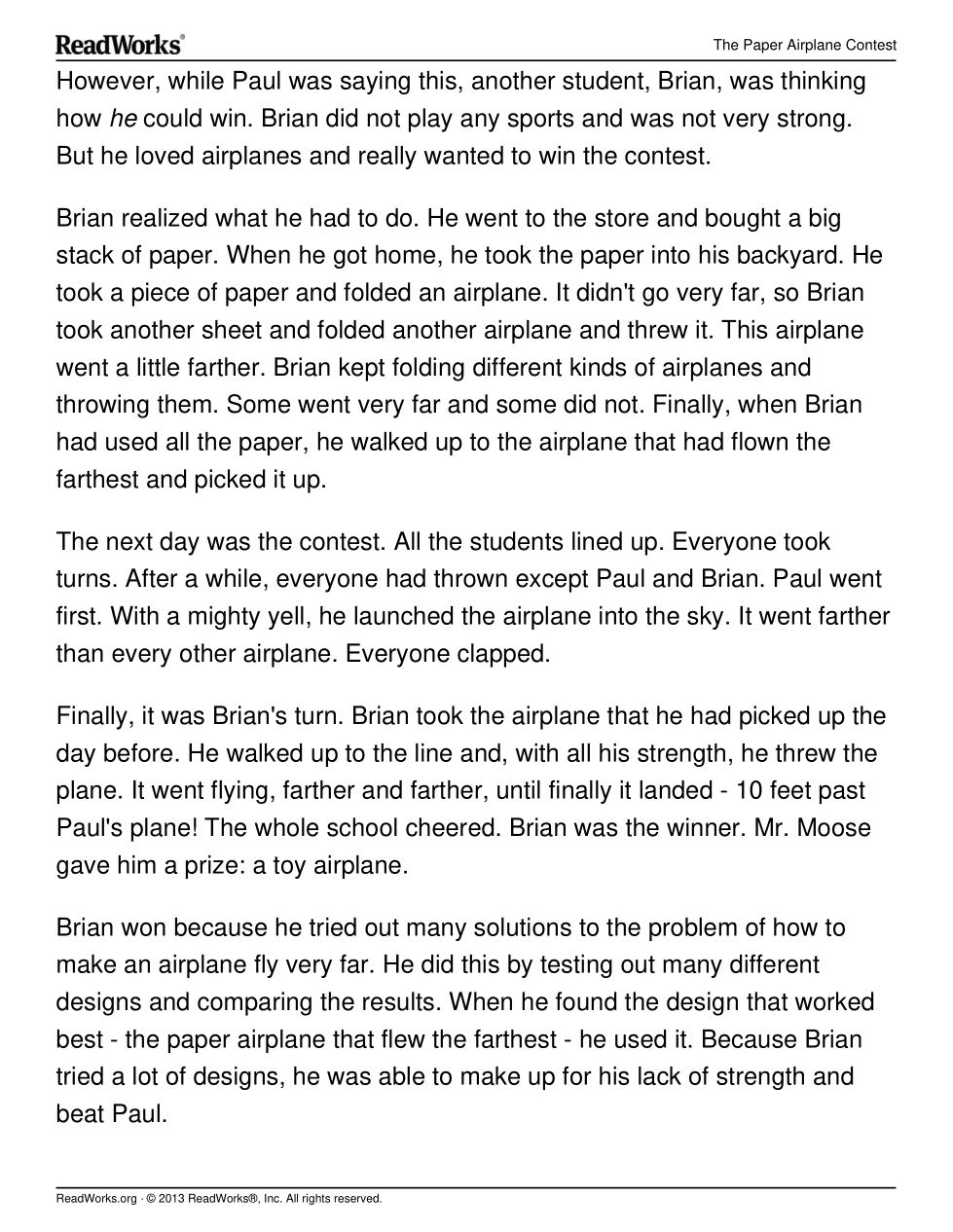 Read these sentences: “Brian won because he tried out many solutions to the problem of how to make an airplane fly very far. He did this by testing out many different designs and comparing the results. When he found the design that worked best — the paper airplane that flew the farthest — he used it.”