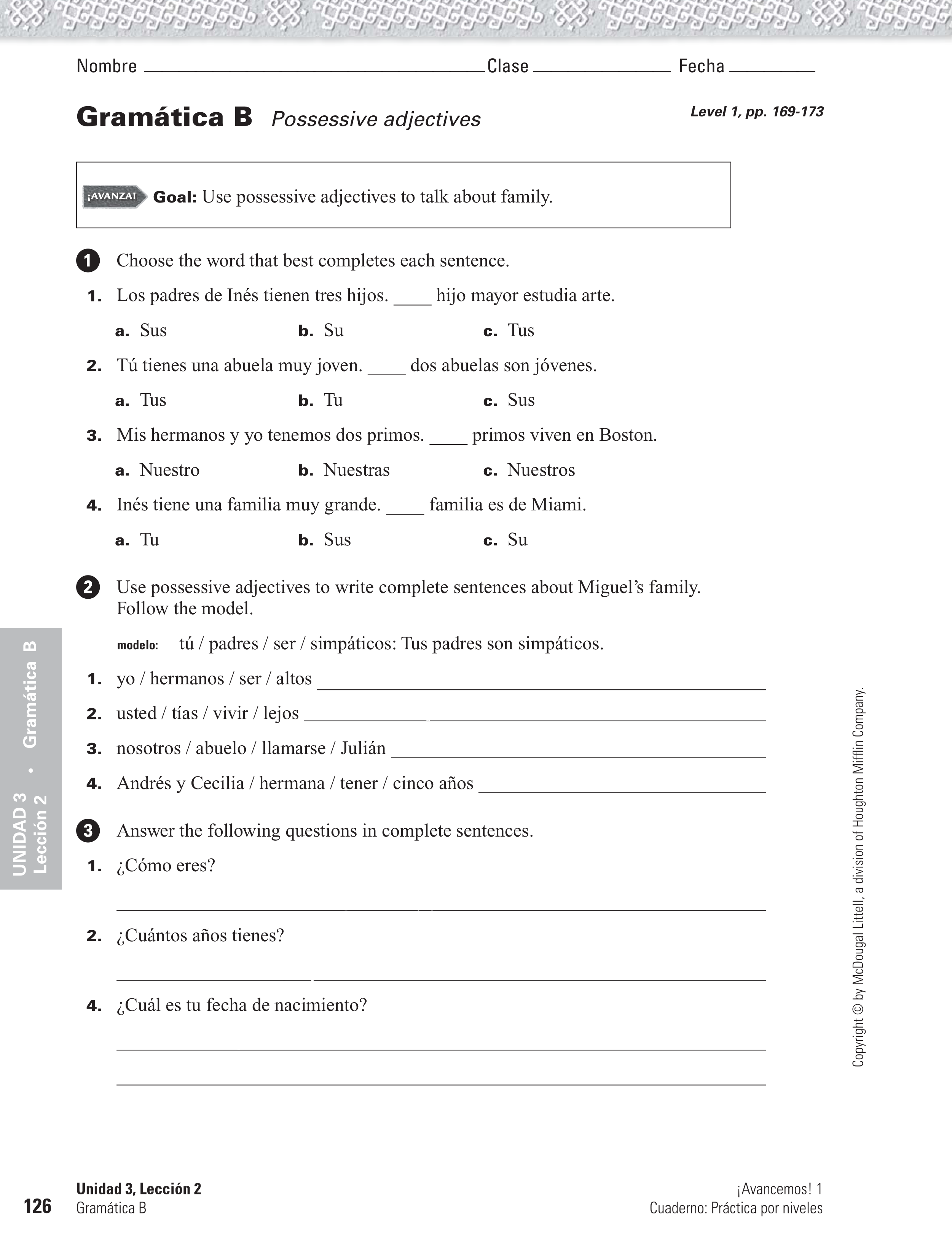 Choose the correct possessive adjective. (hint: look at the form of tener)