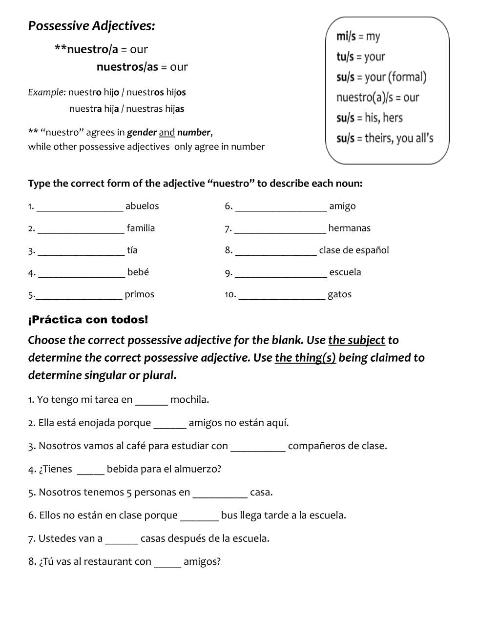 **Remember that nuestro and vuestro must agree in number and gender with what they are claiming!