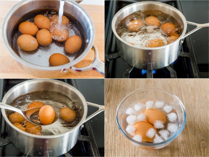 In order to make a hard boiled egg you start with a pot filled with water and an egg. You light the gas stove and place the pot on it. The flame from the burning gas heats the pot which conducts heat to the water. Once the water heats to 100 degrees Celsius the water begins to boil. Immediately you remove the pot from the heat. At this point you start the timer. After ten minutes you must remove the egg from the pot and transfer it to a ice water bath to stop the egg from cooking. Hopefully the egg shell won't crack, but if it does you can still eat it. Once you have peeled your egg, the cooked egg should have a firm white, but not be rubbery. The yolk should be cooked but still a bright yellow.