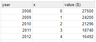 The table shows the value of a car during certain years. Using an expoential model, write an equation for the curve of best fit, then estimate the value of the car in 2016 (x=8).