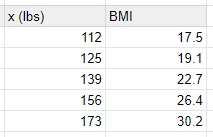 The table below shows the weights of five females of the same height (5'5") along with their body mass index, BMI. Using a logarithmic model, write an equation for the curve of best fit, then estimate the BMI of a female that weighs 130 pounds.