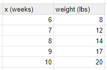 The Brown's adopted a 6-week-old puppy that weighed 8 pounds. The table below shows the weight of the puppy each week thereafter. Find which model best fits the data, then find the age (in weeks) at which the puppy will weigh 50 lbs.