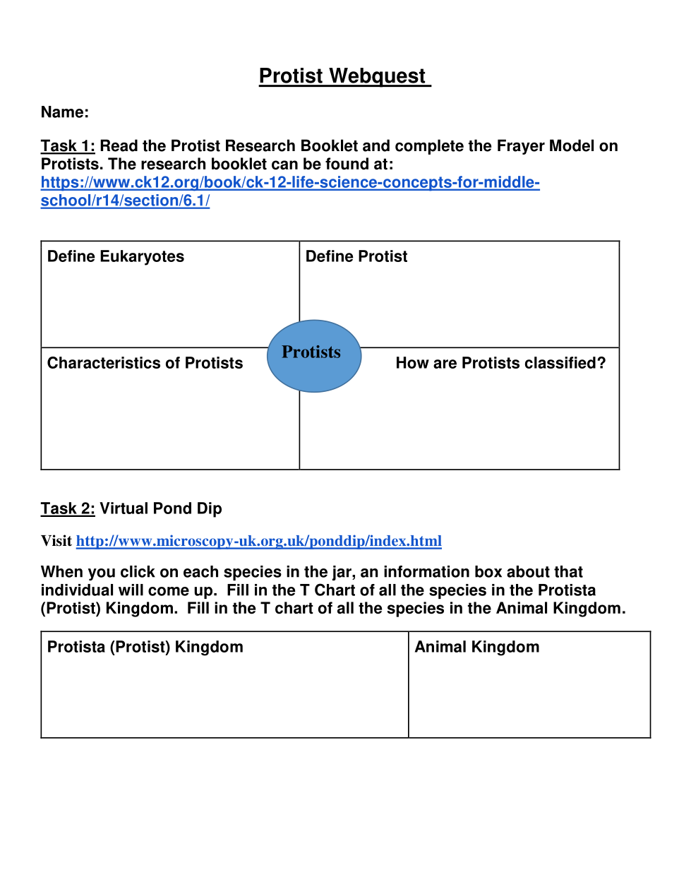 Task 1: Read the Protist Research Booklet and complete the Frayer Model on Protists. The research booklet can be found at: