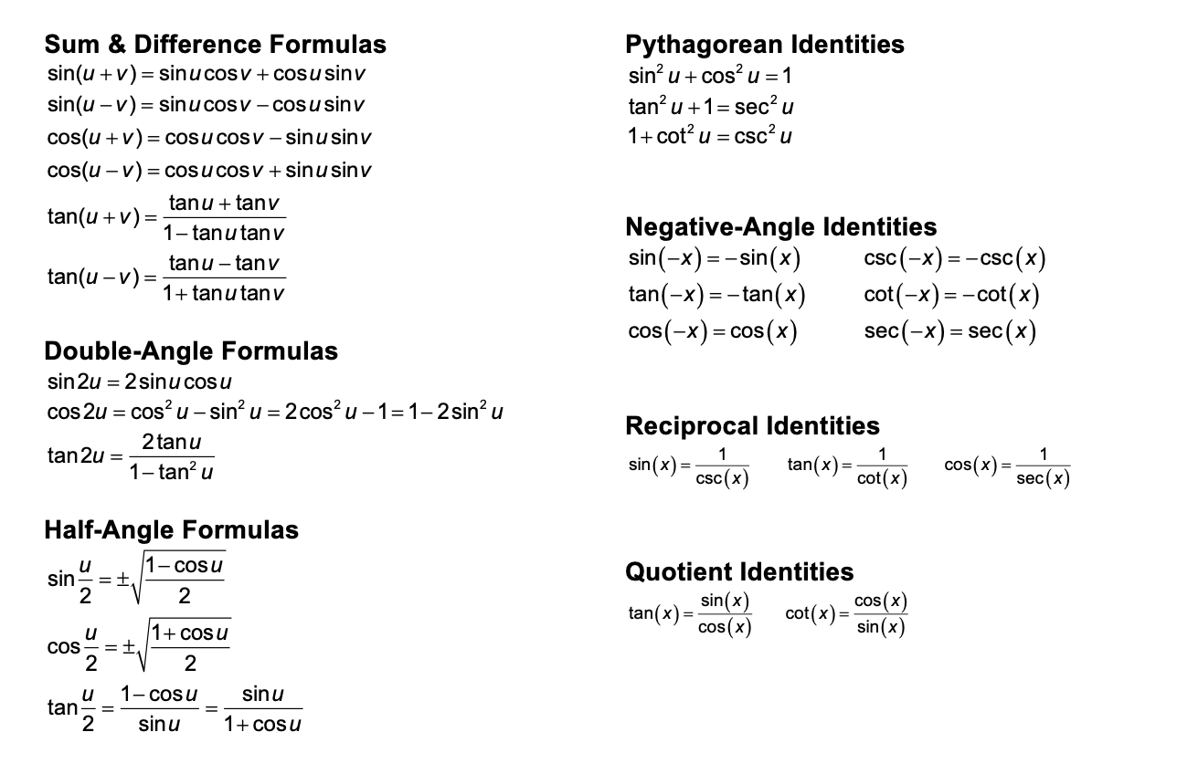 Make sure you have all of your formulas memorized for your formula quiz next class! You will not need to know Half-Angle Formulas